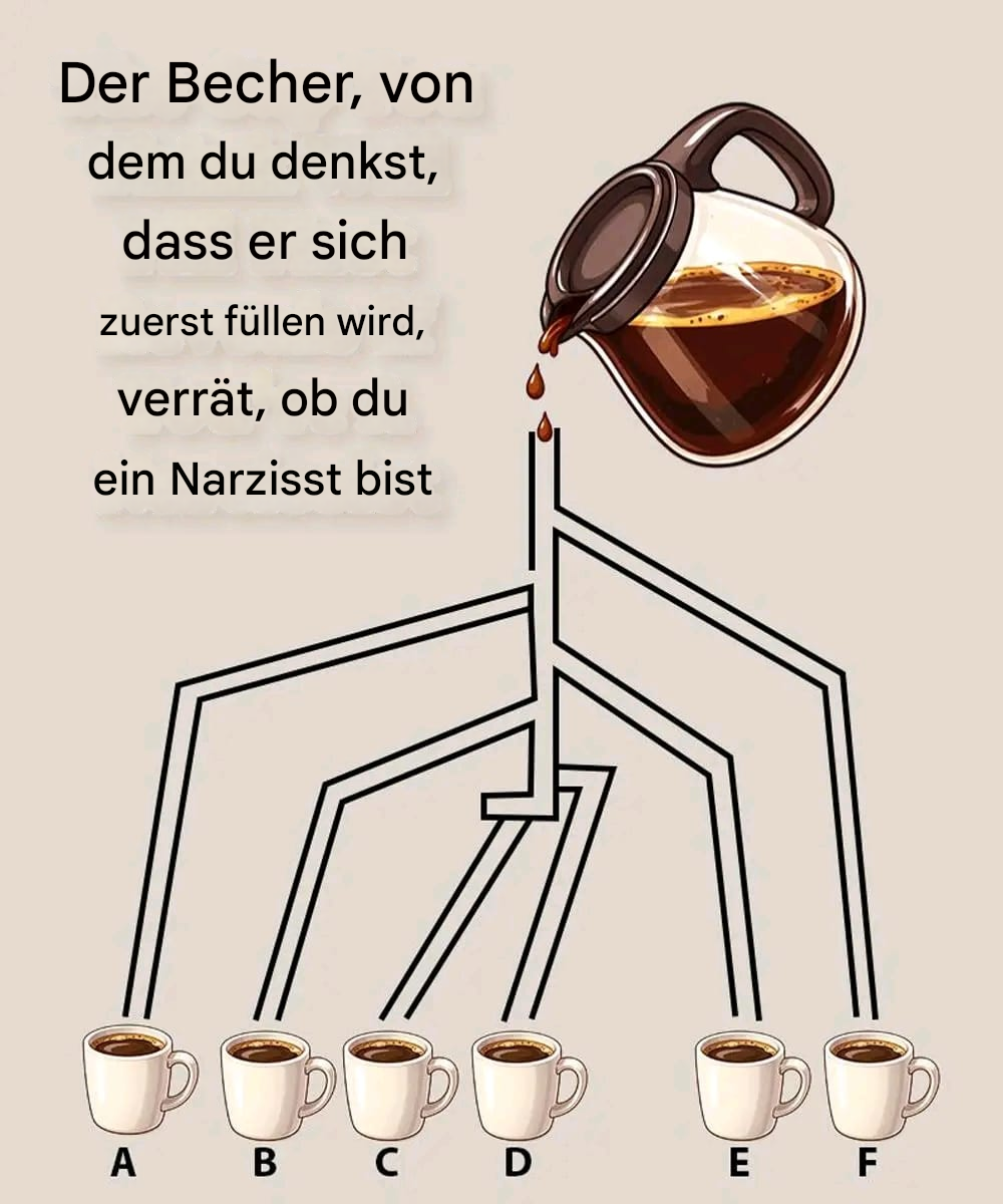 Auf den ersten Blick wirkt dieses Bild wie ein einfaches Logikrätsel. Kaffee fließt durch ein Rohrsystem zu sechs Tassen, die mit A bis F beschriftet sind. Die Herausforderung scheint einfach: Welche Tasse füllt sich zuerst?