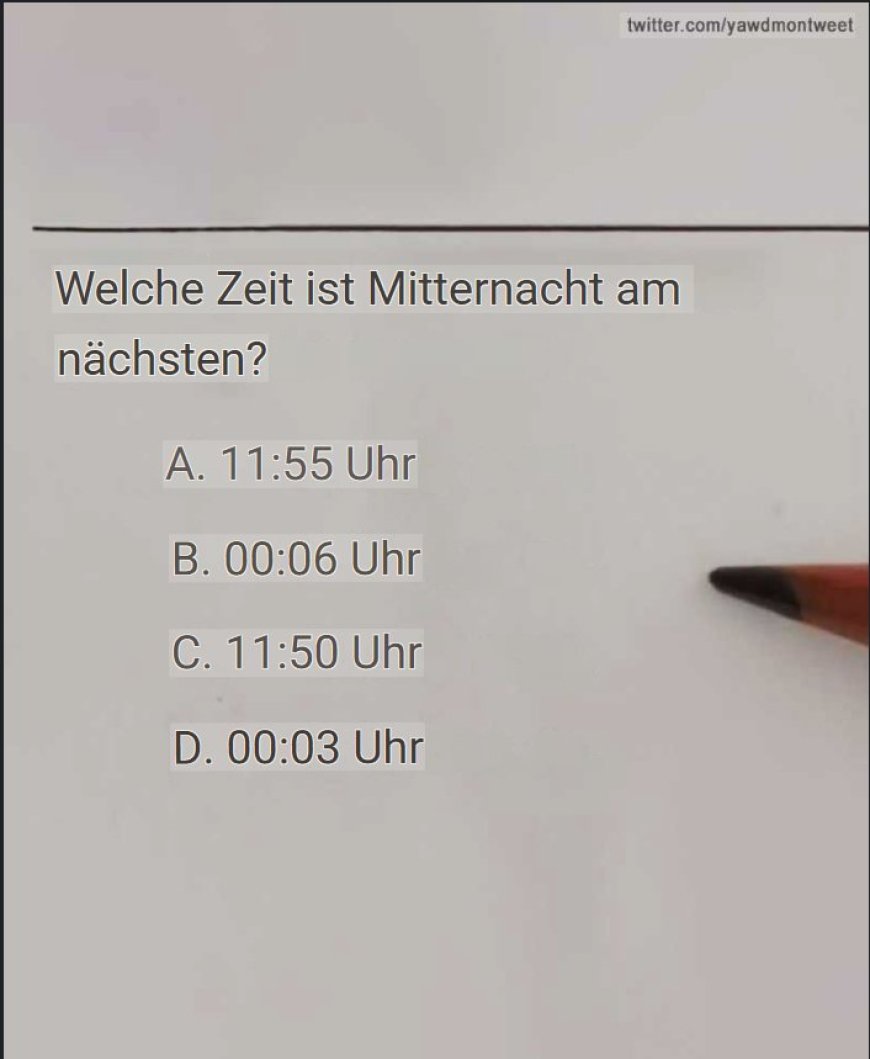 Personen, die sich für die Antwort « A » entschieden haben, wurden möglicherweise durch die Formulierung in die Irre geführt. Da sich die Frage auf Mitternacht, also 12 Uhr, bezog, mag die Einbeziehung von 11:55 Uhr fälschlicherweise nahe gerückt sein.