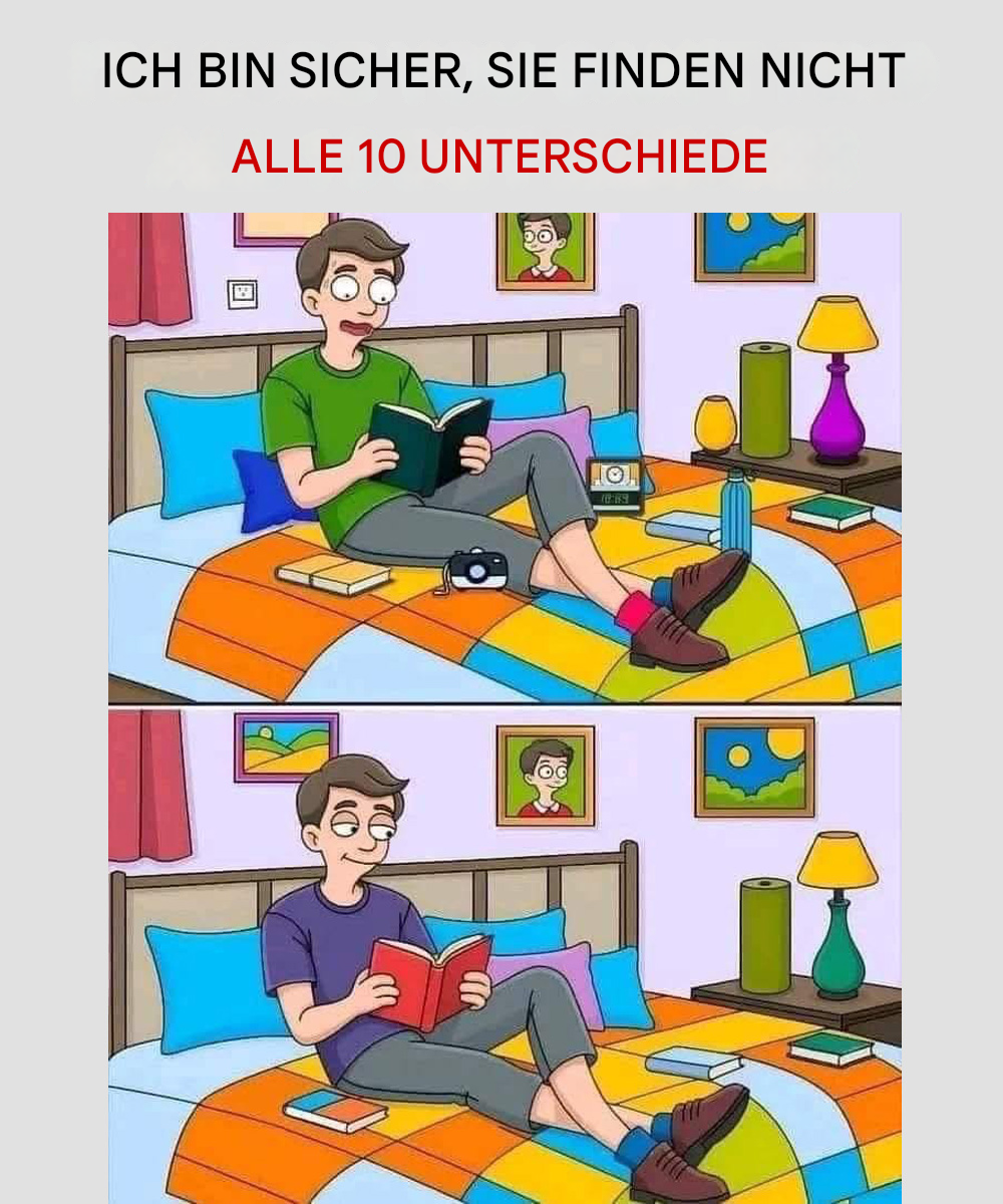 Auf den ersten Blick wirken die beiden Bilder identisch – ein junger Mann, der entspannt auf seinem Bett liegt und in ein Buch vertieft ist. Die helle Bettdecke, das aufgeräumte Zimmer und das warme Licht schaffen eine gemütliche und friedliche Atmosphäre. Doch bei genauerem Hinsehen erkennt man, dass die Bilder nicht ganz gleich sind. In dieser fröhlichen Illustration verbergen sich einige subtile Unterschiede, die darauf warten, entdeckt zu werden.