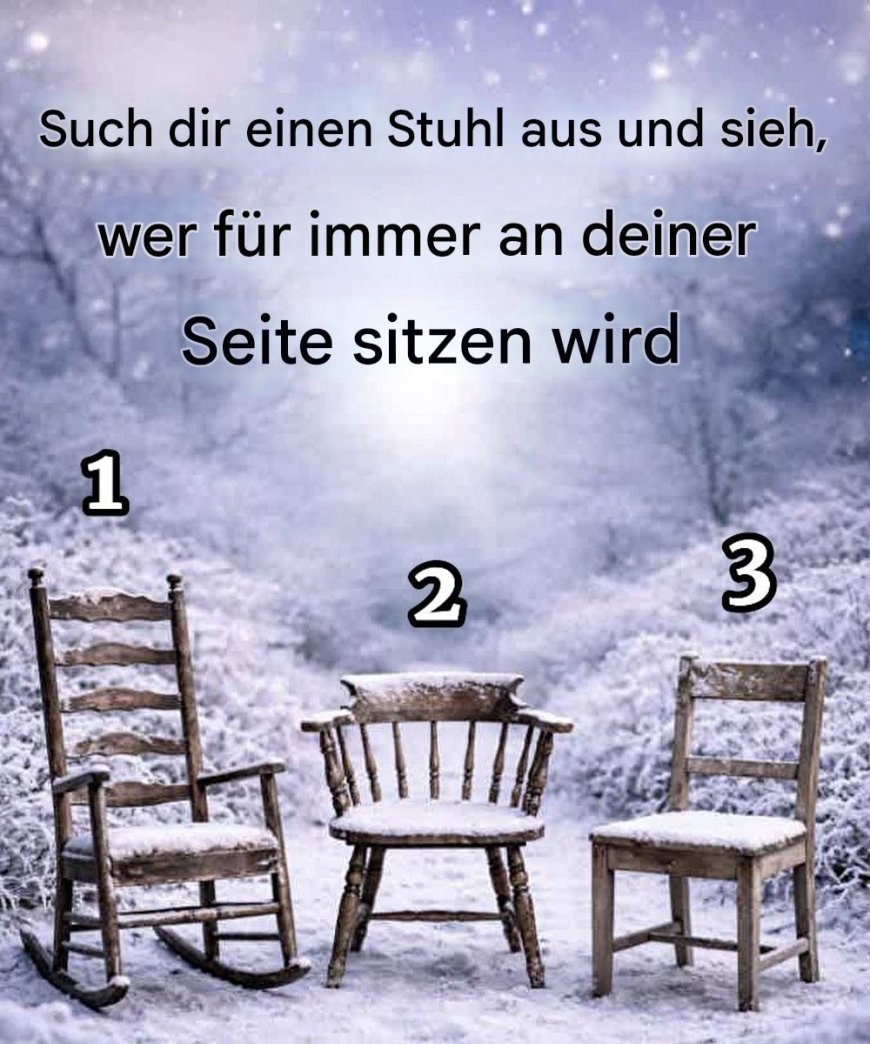 Manchmal braucht es nur ein einfaches Bild, um tiefere Wahrheiten über unser Leben und unsere Beziehungen sichtbar zu machen. Die Menschen, die uns auf unserem Weg begleiten, kommen aus unterschiedlichen Gründen in unser Leben – manche bleiben nur für eine bestimmte Zeit, andere für immer. Diese kleine gedankliche Übung lädt dich dazu ein, kurz innezuhalten und auf dein eigenes Gefühl zu hören. Welcher Platz fühlt sich für dich richtig an? Welcher Stuhl spricht dich spontan an? Deine Wahl ist kein Zufall, denn sie spiegelt wider, was dein Herz im Moment sucht und welche Art von Nähe, Sicherheit oder Freiheit dir gerade am wichtigsten ist.