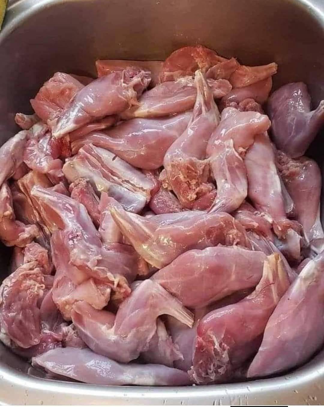 Auf dem Bild sieht man kleine, sehr magere Keulen mit dünnen Knochen und wenig Fett . Die Form ist schmal und leicht gebogen – typisch für Froschschenkel (Froschfleisch) .
