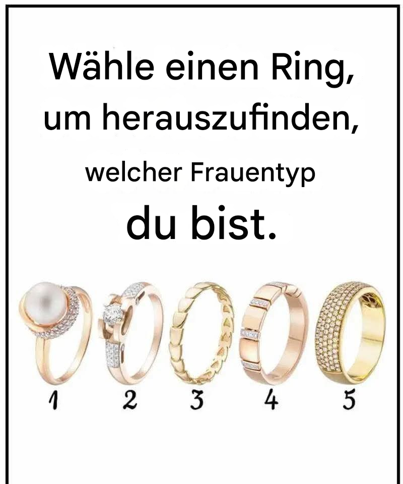 Betrachte die fünf Ringe im Bild oben und wähle denjenigen, der dich sofort anspricht. Überlege nicht lange und entscheide dich einfach für den Ring, der am besten zu dir passt. Sobald du dich entschieden hast, lies die Beschreibung unten, um herauszufinden, was deine Wahl über deine Persönlichkeit aussagt.