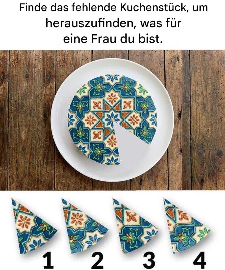 Das Bild zeigt eine wunderschön verzierte Torte, der ein Stück fehlt. Unter der Torte finden Sie vier mögliche Stücke, die die Lücke füllen könnten. Nur eines passt perfekt. Ihre Aufgabe ist einfach: Betrachten Sie das Muster, vertrauen Sie Ihrem Gefühl und wählen Sie das Stück, das sich für Sie richtig anfühlt.